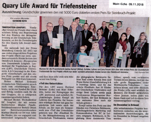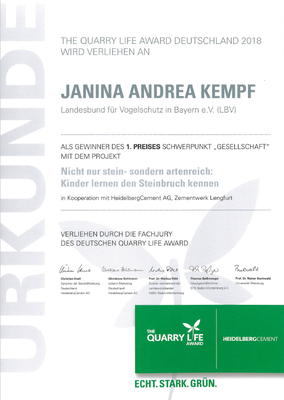 den Quarry Life Award in der Kategorie "Gesellschaft". Der Quarry Life Award ist ein Wissenschafts- und Bildungswettbewerb, welcher von HeidelbergCement ins Leben gerufen wurde.